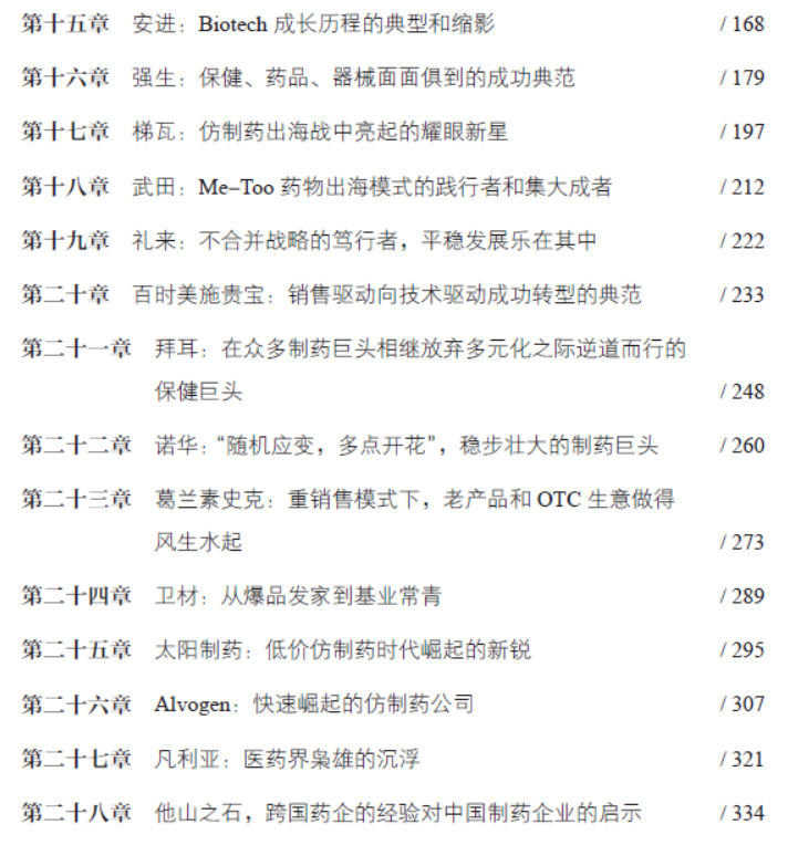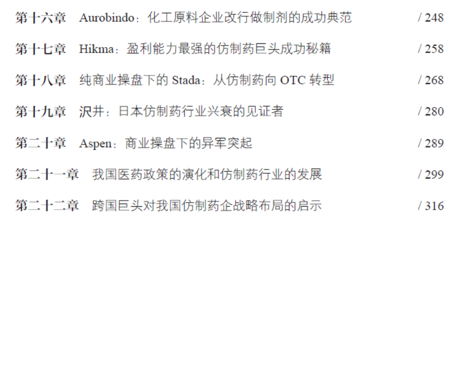 是《跨国药企成功启示录》的姊妹篇出版于2023年,由中国医药科技出版社出版,张伟、郭云沛两位重量级行业协会会长写序推荐,是一本以仿制药行业的发展与演变为主线的书籍。全书22个章节,近40万字,可分为三个部分,第一部(1-5章)讲述了仿制药的历史与意义,全球仿制药行业的兴衰与发展,简要阐述了仿制药行业的运营逻辑,美国、欧洲、日本仿制药的政策、法规的历史沿革,市场发展规律,当下的市场概况和未来的发展趋势,为仿制药的精细化操盘、出海提供理论基础。第二部(6-20章)讲述了15个仿制药企业在不同时代、不同生存环境下的生存技巧,发展战略。内容包含随形势而不断改变的风险评估,战略战术、操盘手法,产品线布局逻辑和兼并策略,用实际的案例为国内企业的转型、现代化操盘、战略或产品线布局提供正反面的参考。第三部(21-22章)则案例结合实际,讲述我国药品法规、政策的形成与沿革历程,市场发展规律及未来的趋势。最后结合国际、国内形势、跨国仿制药企业的成功经验与失败教训,以及我个人的知识与经验,进一步讨论我国仿制药企业的发展战略、转型策略和产品布局,并提出了方法和建议。其目录如下