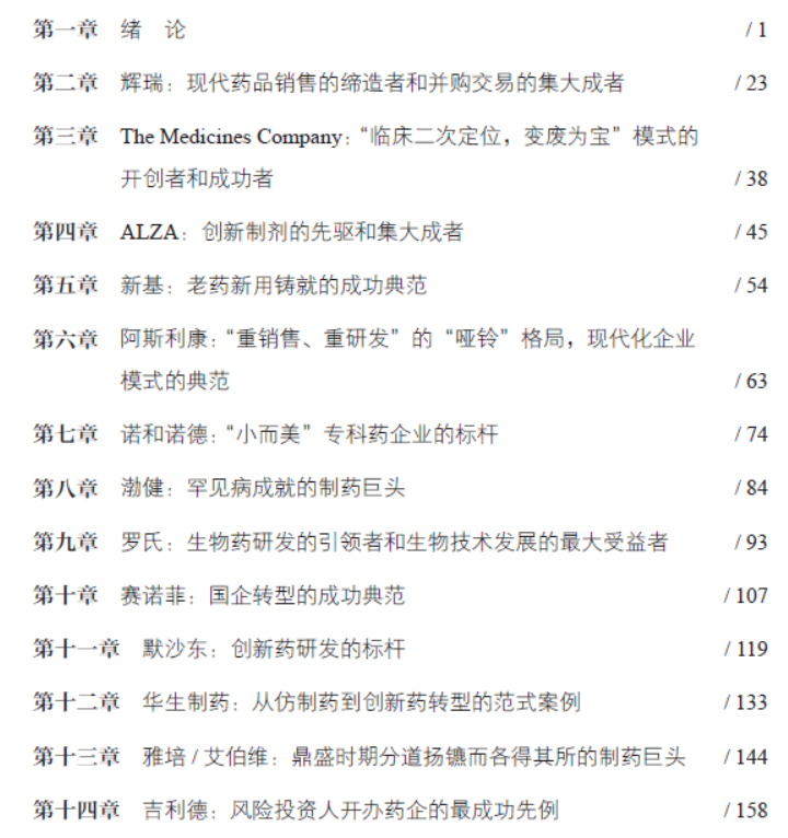 出版于2022年,由中国医药科技出版社出版,张礼和、蒋华良两位院士写序推荐,是一本以创新药行业的发展与演变为主线的书籍。全书共28 章、54.5万字,介绍了现代制药业的发展历程和26 家国际制药企业的兴衰成败。26 家企业来自不同国家、起源于不同时代背景、发展模式也迥异,它们的发家模式和经典案例,可为我国广大企业的转型战略和产品布局提供参考和启示,对厘清国际市场和国家政策、更好地把握行业发展方向也有极大的帮助。本书内容言简意赅、通俗易懂,最大的特点是在读“故事”时即可深入了解制药企业的发展秘诀。跨国药企成功启示录目录1