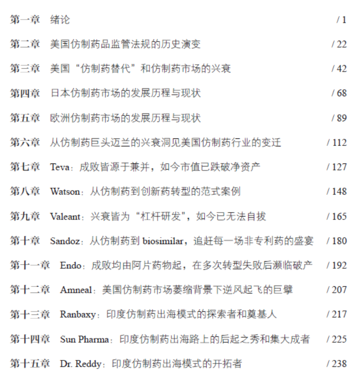 是《跨国药企成功启示录》的姊妹篇出版于2023年,由中国医药科技出版社出版,张伟、郭云沛两位重量级行业协会会长写序推荐,是一本以仿制药行业的发展与演变为主线的书籍。全书22个章节,近40万字,可分为三个部分,第一部(1-5章)讲述了仿制药的历史与意义,全球仿制药行业的兴衰与发展,简要阐述了仿制药行业的运营逻辑,美国、欧洲、日本仿制药的政策、法规的历史沿革,市场发展规律,当下的市场概况和未来的发展趋势,为仿制药的精细化操盘、出海提供理论基础。第二部(6-20章)讲述了15个仿制药企业在不同时代、不同生存环境下的生存技巧,发展战略。内容包含随形势而不断改变的风险评估,战略战术、操盘手法,产品线布局逻辑和兼并策略,用实际的案例为国内企业的转型、现代化操盘、战略或产品线布局提供正反面的参考。第三部(21-22章)则案例结合实际,讲述我国药品法规、政策的形成与沿革历程,市场发展规律及未来的趋势。最后结合国际、国内形势、跨国仿制药企业的成功经验与失败教训,以及我个人的知识与经验,进一步讨论我国仿制药企业的发展战略、转型策略和产品布局,并提出了方法和建议。其目录如下